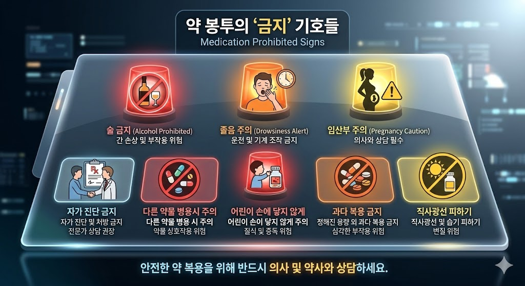 - 🚗 운전 조심 (자동차 기호): 콧물약이나 감기약에 많습니다. 항히스타민 성분이 졸음을 유발하므로 운전이나 기계 조작 전에는 절대 금물입니다.
