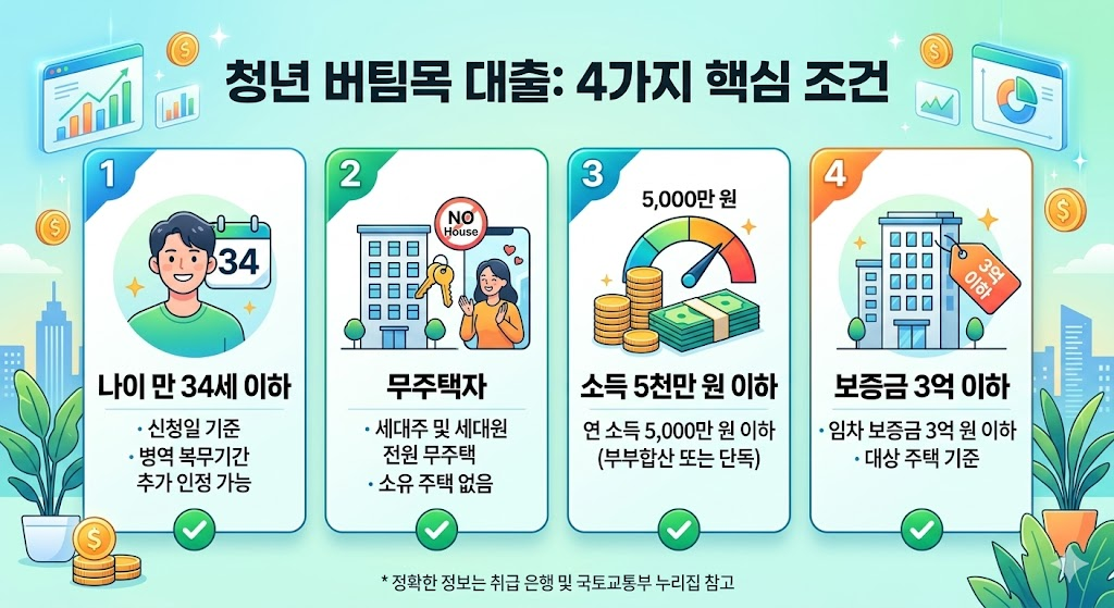 - 보증금 한도: 임차 보증금이 3억 원 이하일 것. (3억 원이 넘는 비싼 전셋집은 버팀목 대출 대상에서 아예 제외됩니다.)