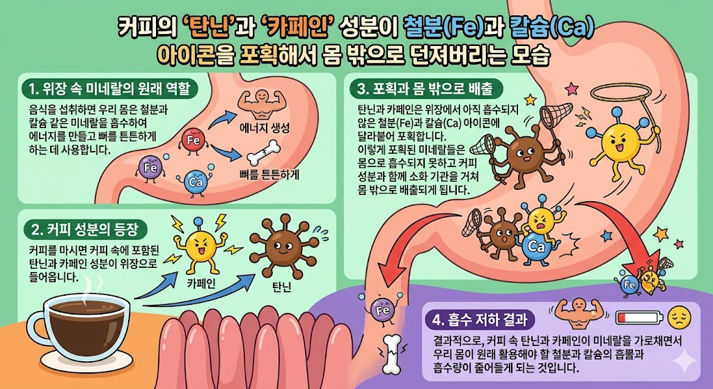 커피 특유의 쌉싸름한 맛을 내는 성분인 **'탄닌(Tannin)'**은 철분과 앙숙입니다.