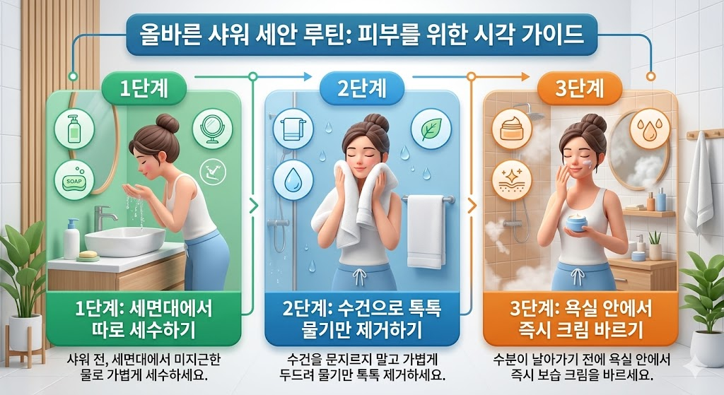 샤워기로 몸과 머리를 다 씻은 뒤, 물 온도를 '미지근하게' 낮추고 수압을 완전히 줄이세요. 그리고 샤워기가 아닌 세면대 앞으로 고개를 숙여 손에 물을 받아 부드럽게 세안합니다. 이것이 피부에 가장 자극을 주지 않는 방법입니다.