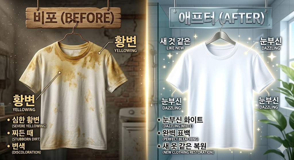 오늘 알려드린 [60도 온수 + 과탄산소다 + 주방세제] 마법의 공식만 기억하신다면, 집에서 잠자고 있는 옷들을 전부 새 옷처럼 눈부시게 부활시킬 수 있습니다! 이번 주말에는 가족들의 누런 셔츠와 티셔츠를 모아놓고 15분의 마법을 꼭 경험해 보세요.