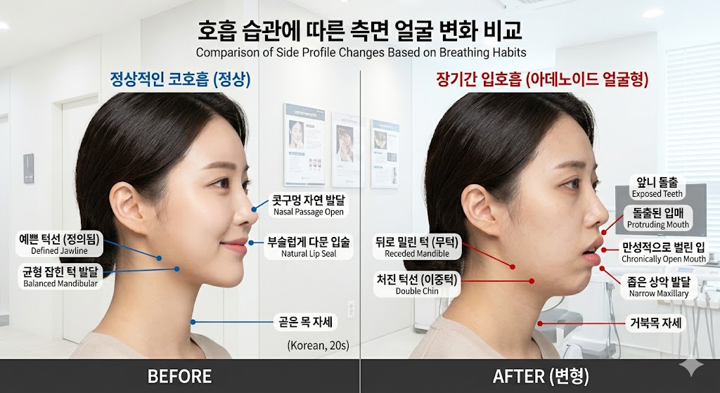 | 2. 얼굴형 변형 (아데노이드 페이스) | 성장기 아이들은 물론 성인도 지속되면 얼굴이 망가집니다. 턱이 아래로 처지면서 얼굴이 길어지고, 턱관절이 뒤로 밀려 무턱이 되며, 부정교합(돌출입)을 유발하는 **'아데노이드 얼굴형'**으로 뼈가 변형됩니다. |