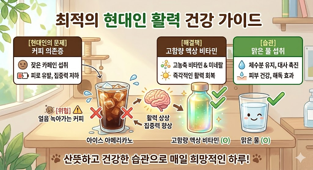 👉 [결론]: 춘곤증을 이기는 정답은 '카페인(각성제)'이 아니라, 바닥난 **'비타민(연료)'**을 채워주는 것입니다!
