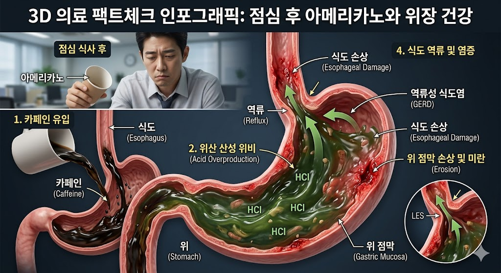 카페인은 위산 분비를 폭발적으로 촉진하는 성질이 있습니다. 이미 밥을 먹어서 위산이 분비되고 있는데, 거기에 커피까지 들어가면 위산이 주체할 수 없이 넘쳐흐르게 됩니다. 이 넘친 위산은 결국 식도를 타고 역류하여 가슴이 타는 듯한 통증(역류성 식도염)과 잦은 트림, 명치 통증을 유발합니다.