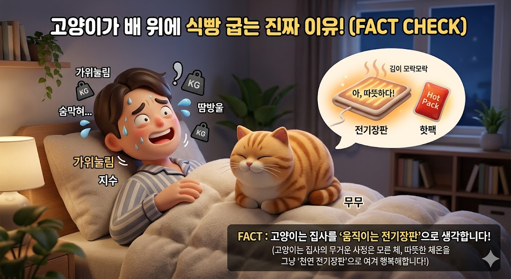 오늘 밤, 우리 고양이가 내 몸 어디에 자리를 잡는지 가만히 관찰해 보세요. 만약 또다시 배 위로 올라와 식빵을 굽는다면, 그 무거운 압박감을 '나를 향한 5kg짜리 묵직한 사랑'으로 기분 좋게 받아들여 주시길 바랍니다. (물론 허리가 부러질 것 같다면 조용히 옆으로 내려놓고 온열 방석을 켜주시는 센스도 잊지 마시고요!)