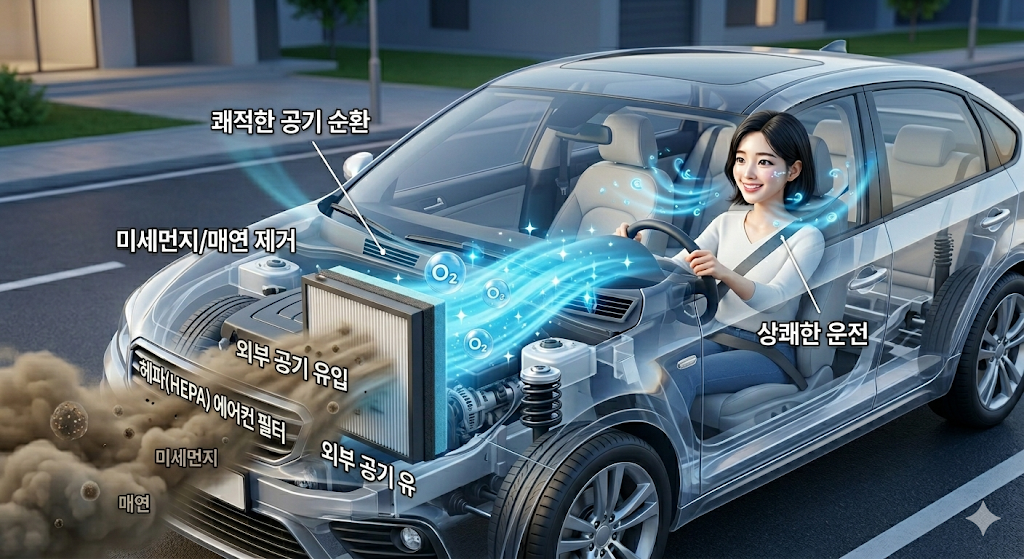 | 3. 핵심 치트키! '헤파(HEPA) 에어컨 필터' | 외기 순환을 마음 놓고 쓰려면 필터가 좋아야 합니다. 저가형 종이 필터는 미세먼지를 못 거릅니다. | 초미세먼지까지 99% 완벽하게 걸러주는 **'자동차용 H11~H13 등급 헤파(HEPA) 필터'**로 교체하세요. 6개월(또는 1만km)마다 갈아주는 것이 생명줄입니다. |