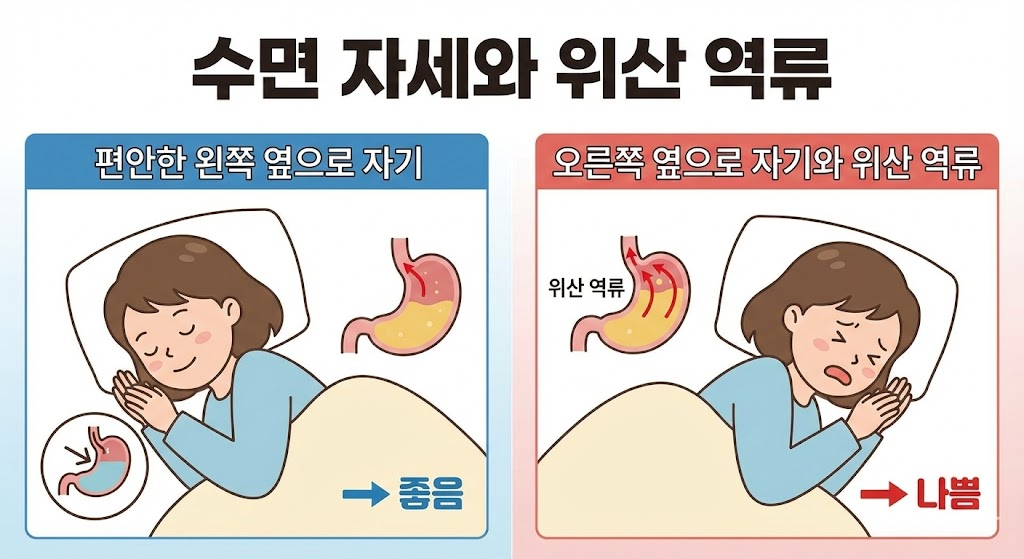 | 오른쪽으로 눕기 | 위장의 입구가 아래쪽으로 쏠려, 위산이 식도 쪽으로 쉽게 쏟아집니다. | ❌ (절대 금지) |