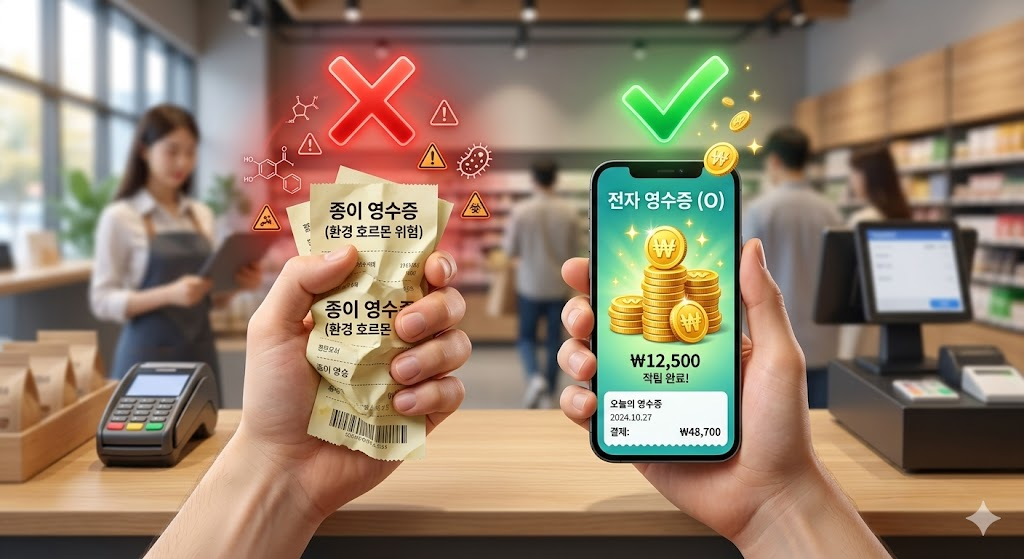 1. "영수증 드릴까요?" 이 질문에 당신의 대답은?안녕하세요! 매일 무심코 지나치는 일상 속에서 건강과 돈을 동시에 지켜드리는 **'1분꿀팁저장소'**입니다. 🧾✨마트나 편의점, 카페에서 결제를 마치면 항상 듣는 질문이 있습니다. "영수증 필요하세요?" 대부분은 지갑이 뚱뚱해지는 게 싫어서 "버려주세요"라고 하거나, 교환/환불을 위해 아무 생각 없이 맨손으로 받아 지갑 속에 쑤셔 넣곤 합니다.그런데 우리가 매일 맨손으로 만지는 이 매끈한 종이 영수증이, 사실은 우리의 호르몬 체계를 교란하는 '환경 호르몬 덩어리'라는 사실을 알고 계셨나요? 동시에, 이 영수증을 '전자 영수증'으로 바꾸기만 해도 나라에서 내 계좌로 현금을 꽂아주는 쏠쏠한 혜택이 숨어있다는 것도요!오늘은 맨손으로 영수증을 만지면 안 되는..