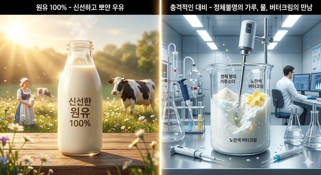 1. "우와, 이 우유 진짜 싸다!" 카트에 담기 전 멈추세요!안녕하세요! 마트 진열대 속에 숨겨진 식품 업계의 교묘한 꼼수를 1분 만에 시원하게 파헤쳐 드리는 **'1분꿀팁저장소'**입니다. 🥛✨요즘 마트에 장을 보러 가면 우유 코너 앞에서 한참을 망설이게 됩니다. 1리터짜리 흰 우유 한 팩이 3천 원을 훌쩍 넘는 고물가 시대니까요. 그러다 유독 눈에 띄는 우유가 있습니다. 겉보기엔 똑같이 뽀얗고, 심지어 포장지에는 푸른 초원과 젖소 그림까지 그려져 있는데 가격은 1,000원 이상 저렴한 '가성비 우유'들입니다."어차피 다 같은 흰 우유인데 싼 게 최고지!" 하며 장바구니에 무심코 두세 팩씩 담으셨나요?그렇다면 당장 그 우유팩의 뒷면을 돌려보세요. 여러분이 싼 맛에 집어 든 그 우유는 젖소에서 갓 짜..
